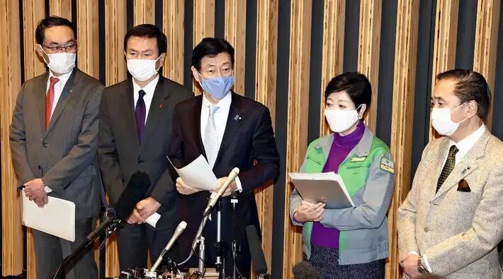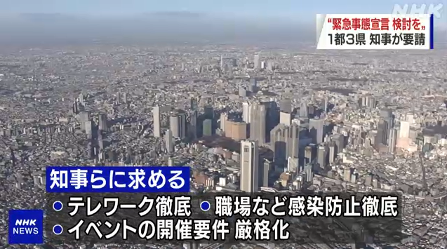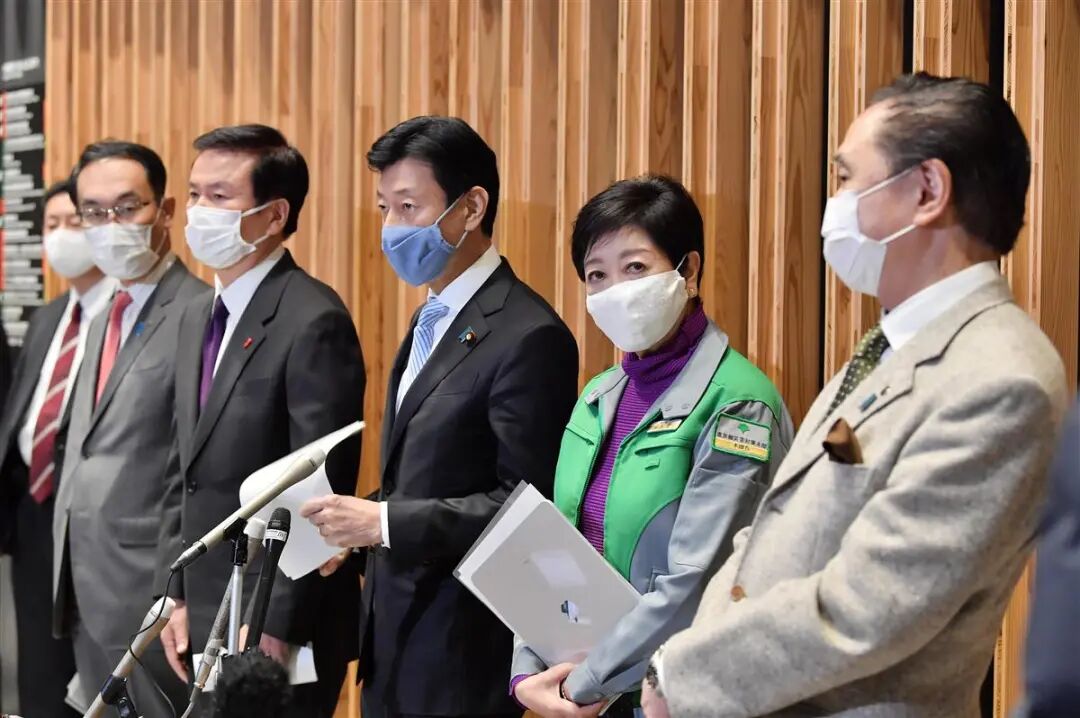 1月2日,东京都、神奈川县、千叶县、埼玉县的四名知事联合向代表中央政府的经济再生大臣西村要请:发令紧急事态宣言。