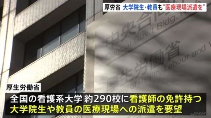 日本厚生劳动省面向280所看护系大学,希望持有护士资格证的大学院生(类似中国的研究生)和教员能被派遣去医疗现场。