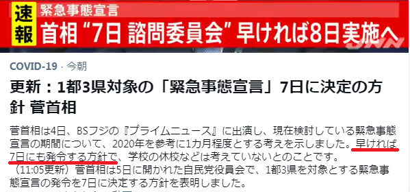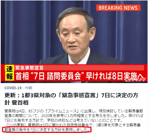 据今天上午的速报新闻:緊急事態宣言の発令を7日に決定する方針を表明しました。