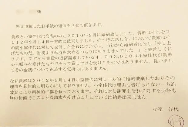 小室母子态度坚定,认定是男方自愿给的,不是借的,所以不还钱天经地义。通过律师,将这封“我不还钱”的通知函发给男方。