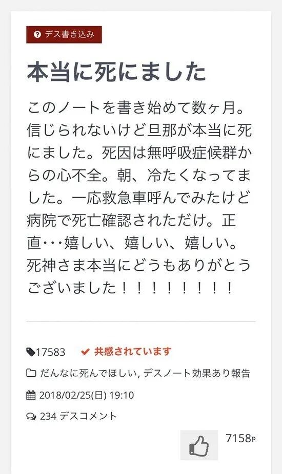 从开始写这个笔记,至今几个月。虽难以置信,但丈夫真的死掉了。死因是无呼吸症候群导致的心力衰竭。早上,人已经冷掉。姑且试着叫了救护车,也只是在医院确认了死亡而已。说实话,高兴,高兴,高兴。真心感谢死神!!!!