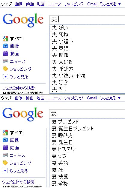 曾经,网民间流传着一个段子:在日版Google上输入“妻子”,自动提示“礼物”;输入“丈夫”,则自动提示“去死”。
