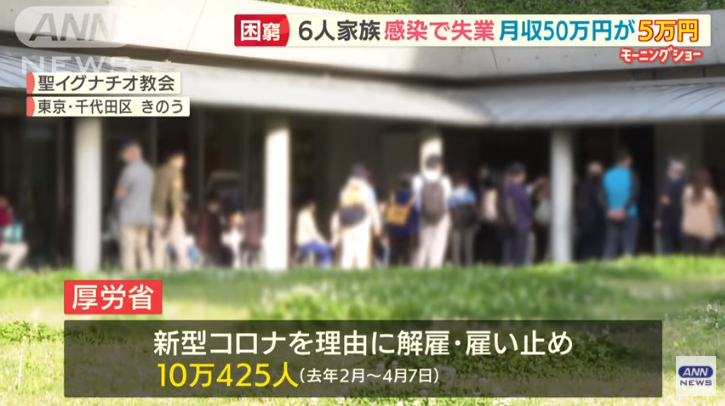 如果放眼整体日本社会,根据厚生省的统计数据:自去年2月,到今年4月7日为止,因新冠病毒而被解雇、停止雇佣的人数,共10万425人。