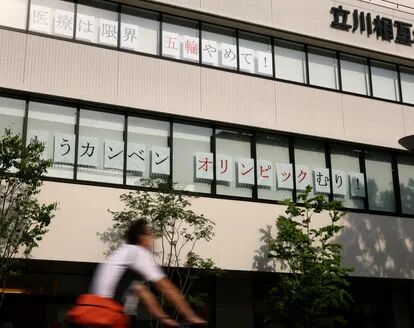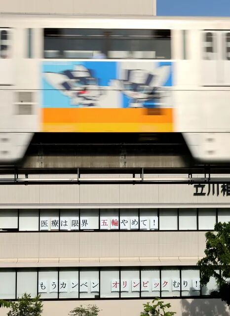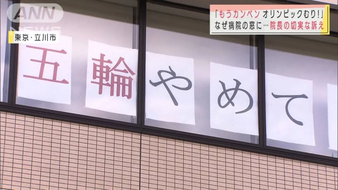 4月底,正是东京宣布第三次进入紧急事态的时候,东京都立川市的立川相互病院在临街那面的窗户玻璃上贴出反对东京奥运的字幅。