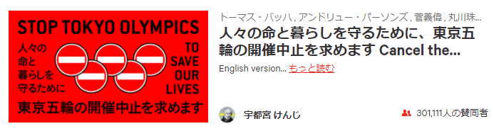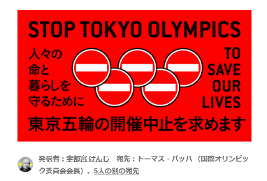5月5日,日本律师协会前会长宇都宫健儿在请愿网上发起请愿:为了守护人们的生命与生活,请求中止召开东京奥运会。
