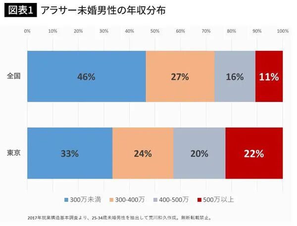 根据日本2017年度的就业构造调查统计,在东京都内,25~34岁未婚男性当中,年薪500万日元以上的约占22%。