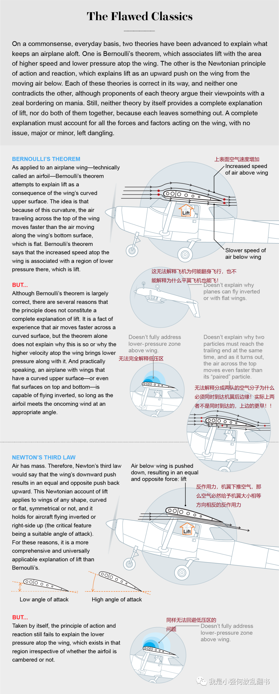 有意思的是,无论伯努利还是牛顿都没有试图解释过飞机的飞行原理,因为他们生活的时代还没有飞机。他们各自的定律和理论只是在莱特兄弟飞行后被重新利用,这使得科学家们了解空气动力学升力成为一项严肃而紧迫的工作。