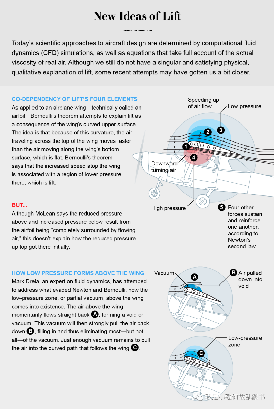 麻省理工学院流体动力学教授,《飞行器空气动力学》一书的作者马克·德雷拉给出了一个答案:“如果空气包裹瞬间飞离机翼顶面的切线,它们下面就会产生真空。”他解释说。“然后,这种真空会吸入包裹,直到它们大部分填充真空,即——直到它们再次与机翼相切。这是迫使包裹沿机翼形状移动的物理机制。仍然存在轻微的局部真空,以使包裹保持在弯曲的路径中。”