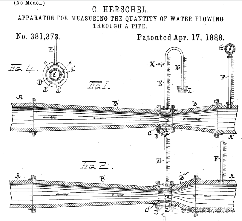 译者注,下边是一个文丘里管的应用的专利(1888年),这个发明可以使用文丘里管进行用水量的测量。