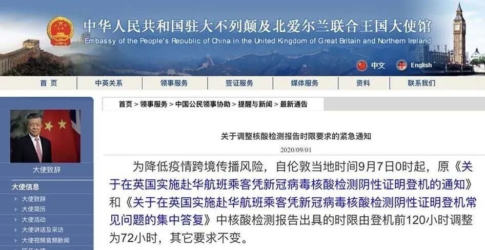 9月1日(周二),中国驻英国大使馆官方发布了油管调整核酸检测报告时限要求的通知:伦敦时间9月7日0时起,英国回国核酸检测证明时限从120小时(5日)缩至72小时(3天)。
