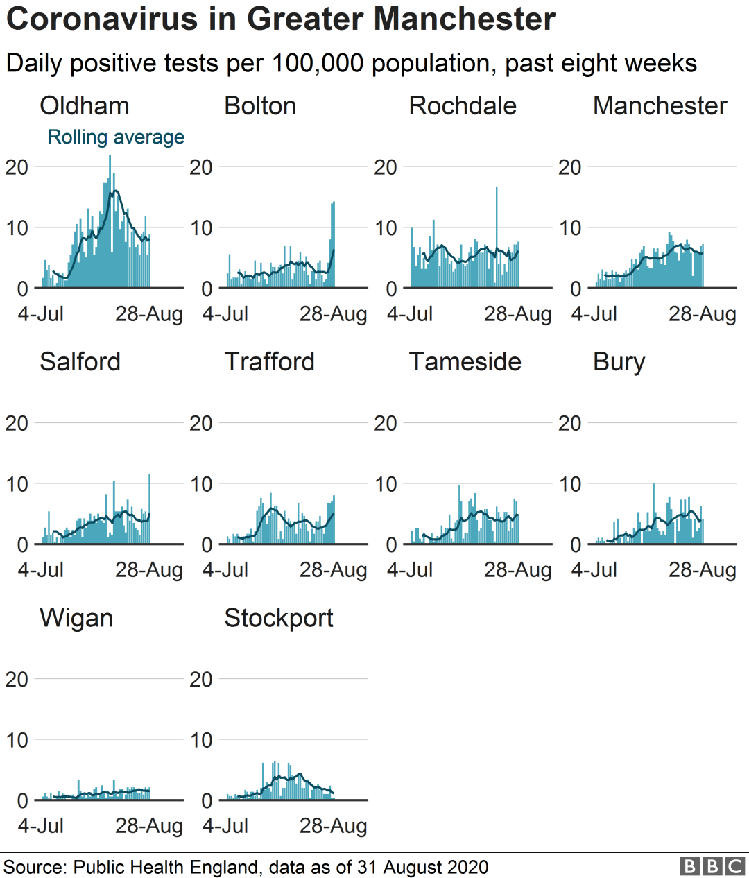 大曼城地区各个城市疫情趋势图|图片信息来源BBC