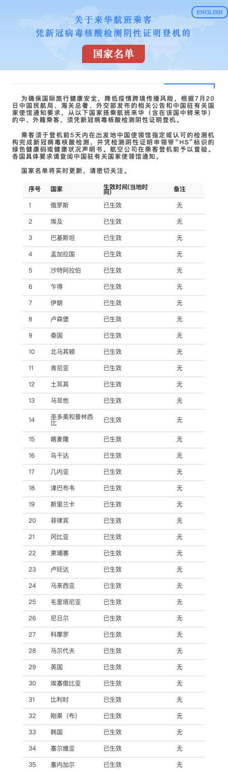 截至9月1日(周二)英国时间17:00,自英国出发直飞/转机前往国内,或从其他地区出发,经停以下107个已实施凭新冠病毒核酸检测阴性证明登机的国家,需