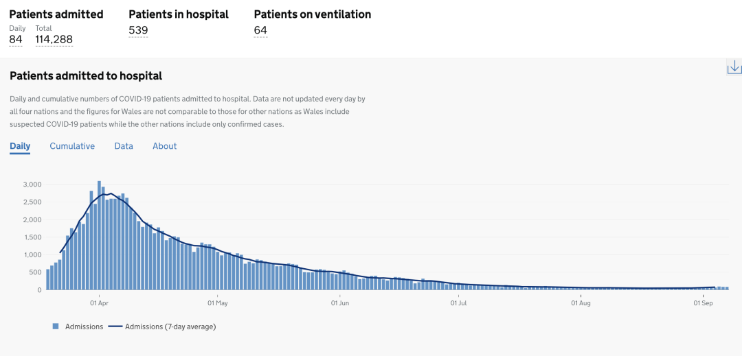 截止至2020年9月10日(周四)英国时间09:00,累计检测结果量17,619,897次(待更新);累计确诊358,138例(+2,919);累计病亡41,608例(+14);