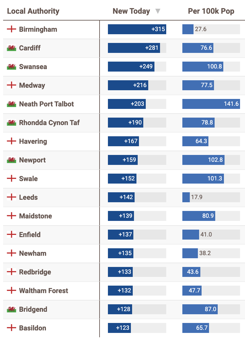 除了英格兰地区,威尔士地区卡迪夫(+281)以及斯旺西(+249)疫情数据也较高。