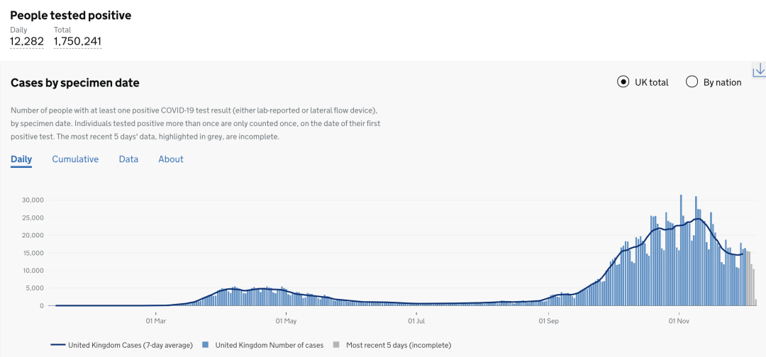 截止至2020年12月8日(周二)英国时间09:00,累计检测结果量43,279,583次(+215,981);累计确诊1,750,241例(+12,282);累计病亡62,033例(+616)。