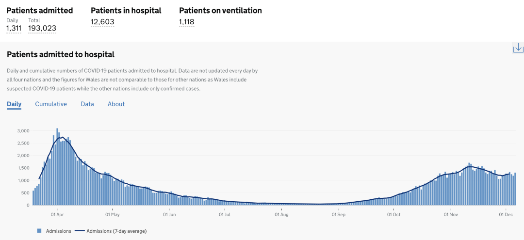 12月8日数据:目前住院的确诊新冠患者12,603人(*),累计住院新冠患者总数为193,023人(+1,311)。