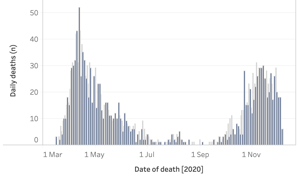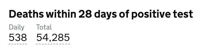 目前英格兰地区使用呼吸机的新冠患者有1,118人(*);病亡新冠患者总计54,285人(+538)。