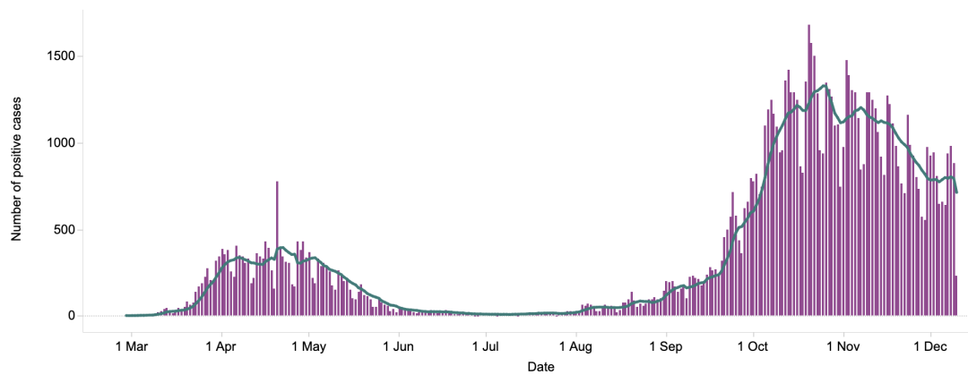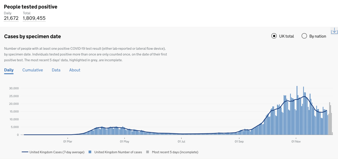 截止至2020年12月11日(周五)英国时间09:00,累计检测结果量44,357,906次(+400,646);累计确诊1,809,455例(+21,672);累计病亡63,506例(+424)。