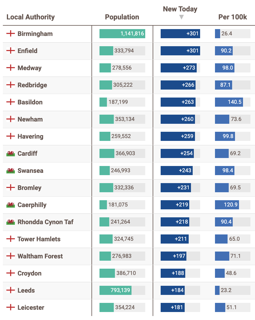 此外,利兹(+184)、莱斯特(+181)以及伦敦多个区等日增均超过150例。