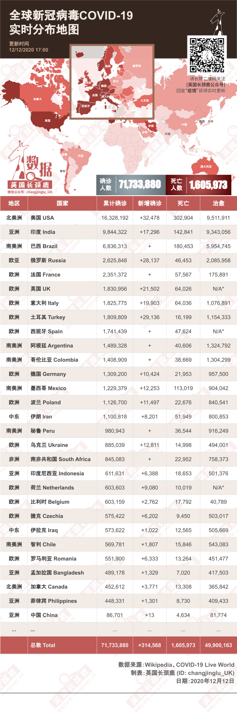 世界的累计确诊人数截止12月12日17:00超过7,173万例(*),死亡超过160.5万例(+10k)。