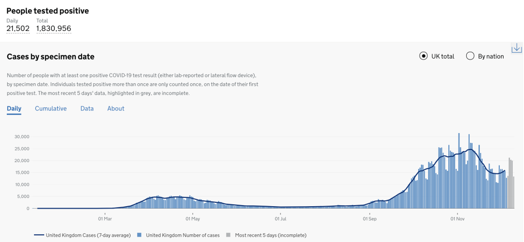 截止至2020年12月12日(周六)英国时间09:00,累计检测结果量44,357,906次(待更新);累计确诊1,830,956例(+21,502);累计病亡64,026例(+519)。