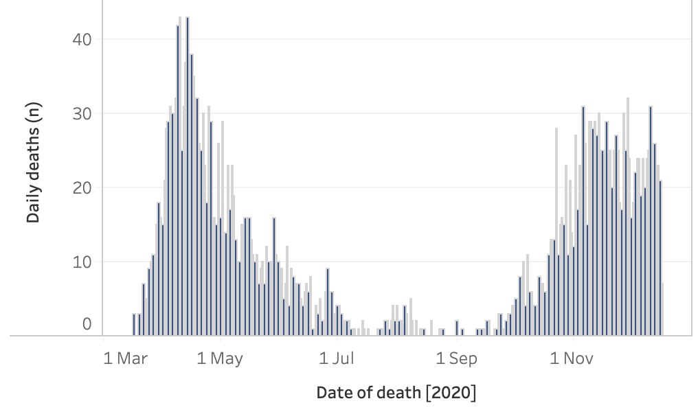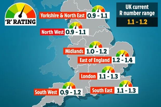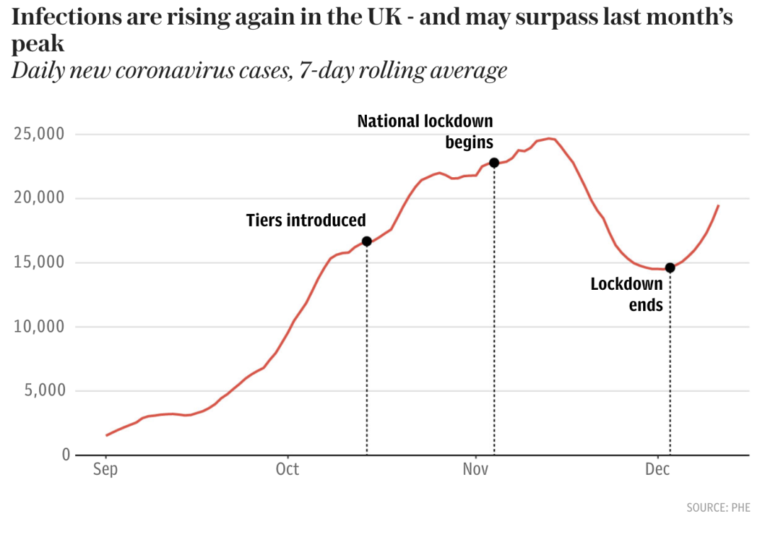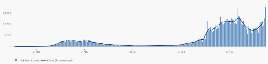 英国又回到了每日21,000例左右的新确诊病例增幅,距离11月的最后一个高峰期只差3000例。本周的感染率R值再次破1,在1.1-1.2之间,意味着情况正在加剧。
