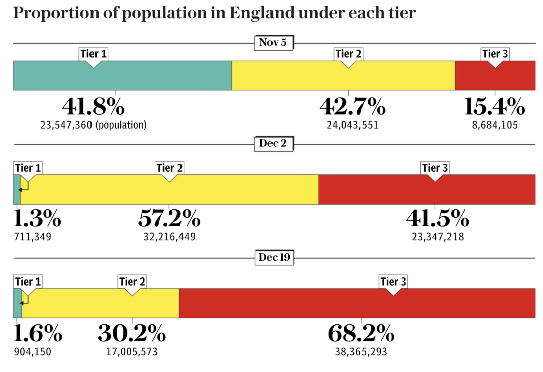 在新地区等级封锁之下,英格兰已有超过3800万人——全英人口的68%将从周六(12月19日)开始进入Tier 3封锁。其中,英格兰东南部大部分地区已经进入了最严厉的封锁水平。