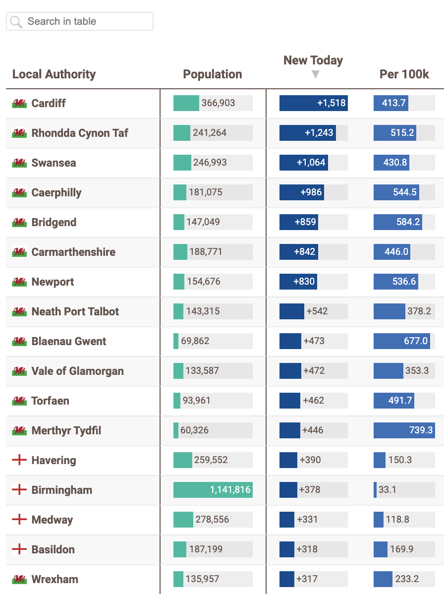 12月17日(周四),新增确诊数量最多的地点为Havering(+390)以及伯明翰(+378)。