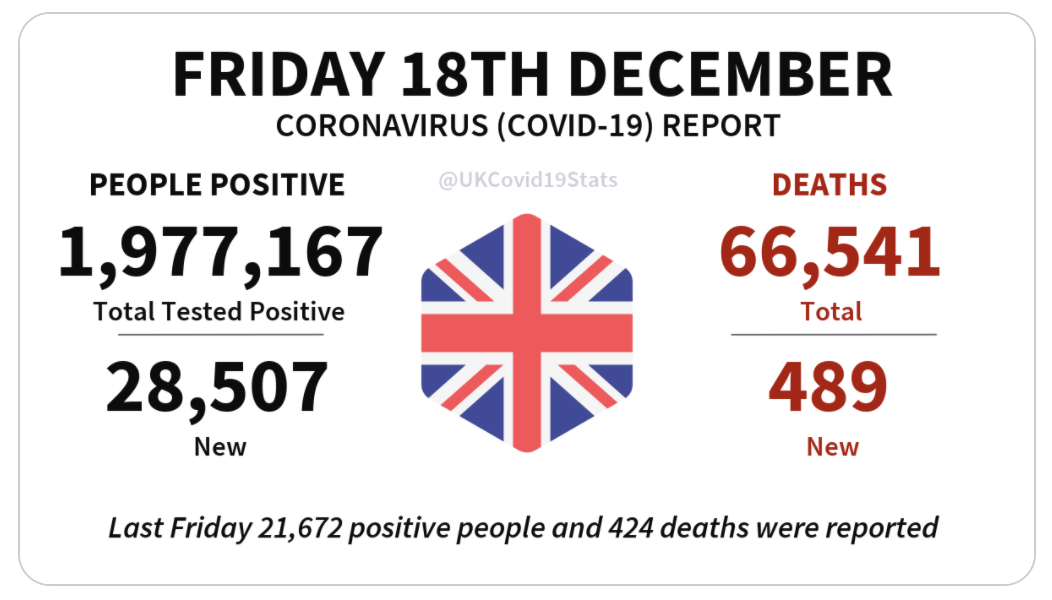 截止至2020年12月18日(周五)英国时间09:00,累计检测结果量46,771,368次(+375,185);累计确诊1,977,167例(+28,507);累计病亡66,489例(+541)。