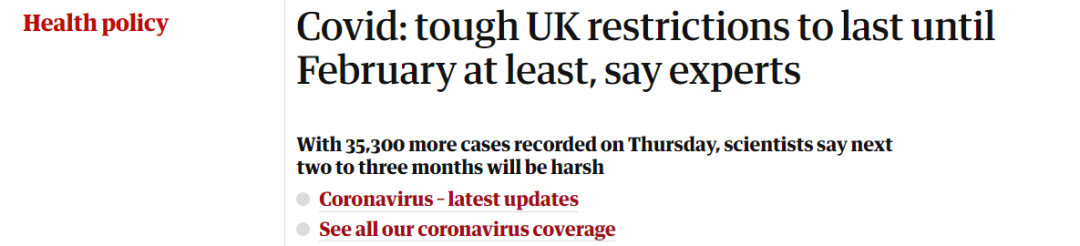 而另一则来自卫报的消息显示,专家称圣诞节临时放宽限制预计将助长病毒的传播,科学家们表示,随后很可能会有严厉的措施,至少要到2月份。