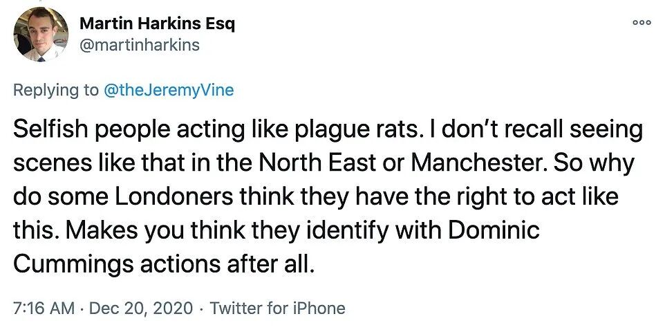 “伦敦人们简直就像撒播病毒的大耗子一样四处逃窜,我怎么不记得当时封锁曼城和东北部时大家这样过?他们伦敦的一些人凭什么这么做?”