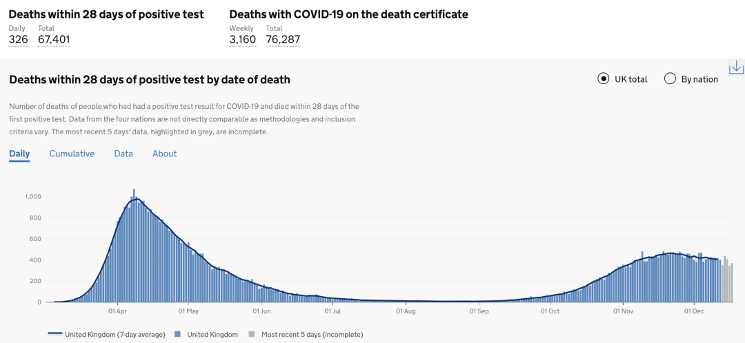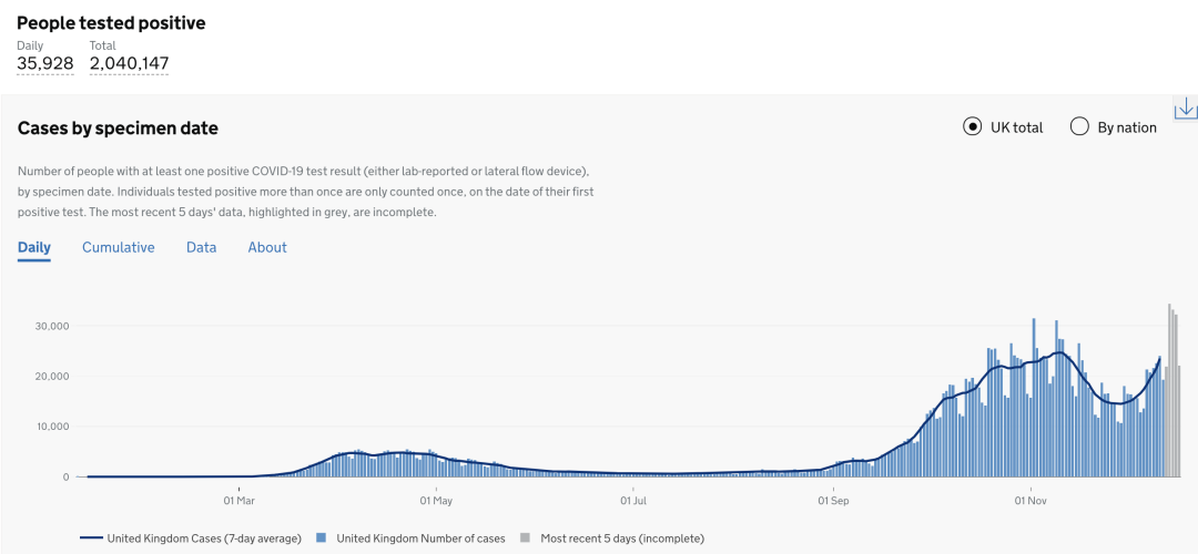 截止至2020年12月20日(周日)英国时间09:00,累计检测结果量46,771,368次(待更新);累计确诊2,040,147例(+35,928);累计病亡67,401例(+326)。