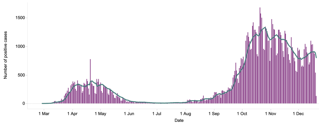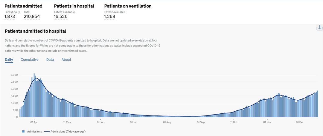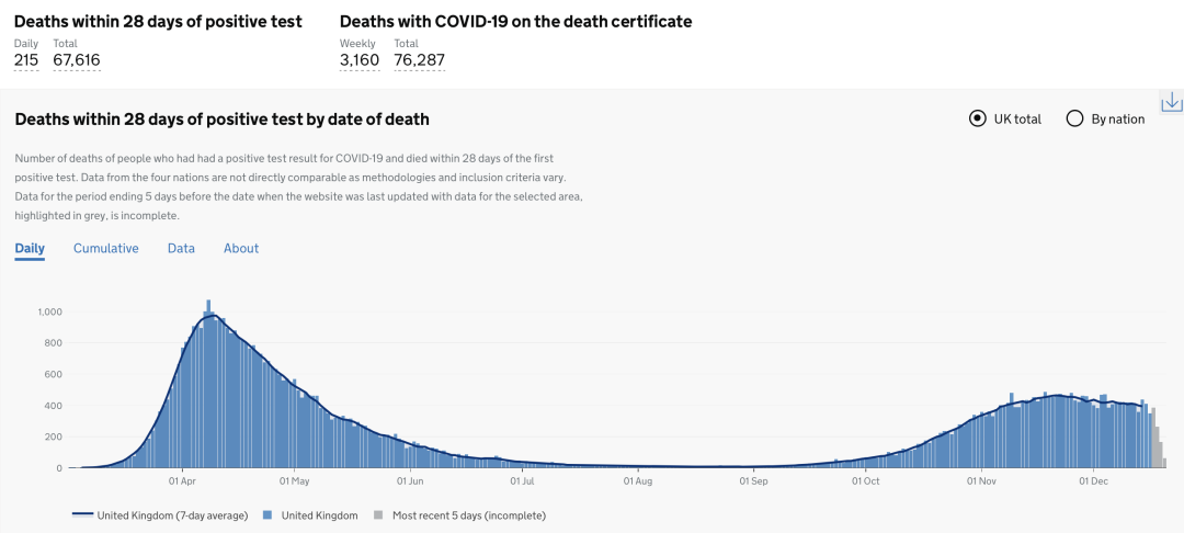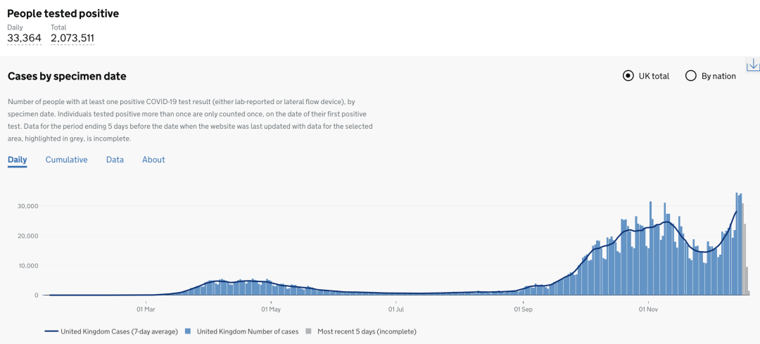 截止至2020年12月21日(周一)英国时间09:00,累计检测结果量48,036,807次(+433,470);累计确诊2,073,511例(+33,364);累计病亡67,616例(+215)。