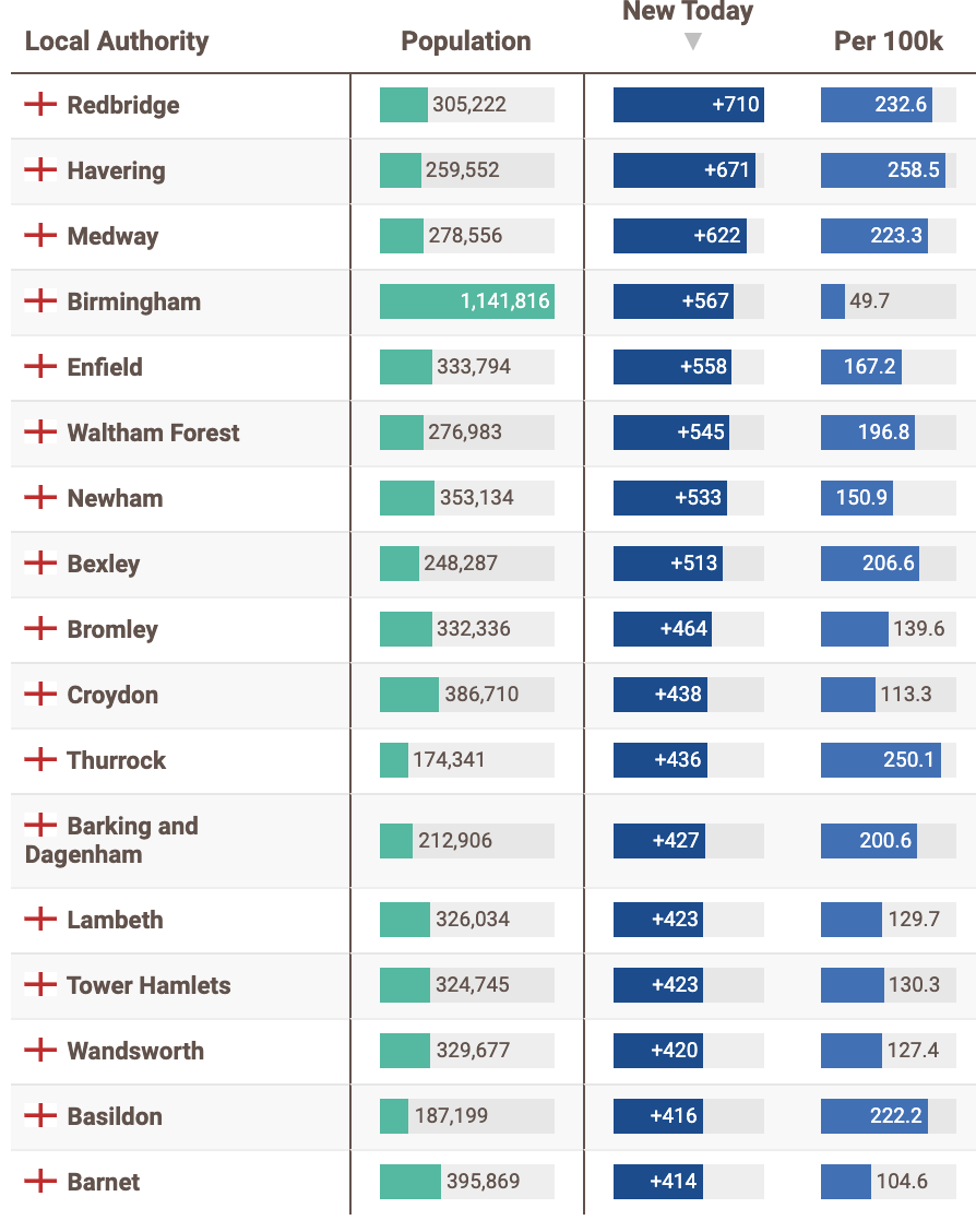 此外,伯明翰(+567)以及伦敦多个地区的单日新增确诊都超过了400例。