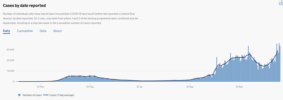 因新型冠状病毒变种在英国肆虐,英国今日又新增3.3万余例,几乎是一周前的数据的两倍。