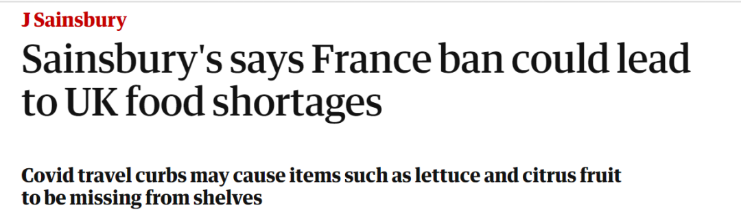 出于对变异新型冠状病毒的担忧,法国周日(12月20日)宣布禁止运输商携带货物跨越海峡。Sainsbury's和Tesco等超市已提醒公众:生菜,西兰花和柑橘类水果可能在圣诞节前将面临短缺。