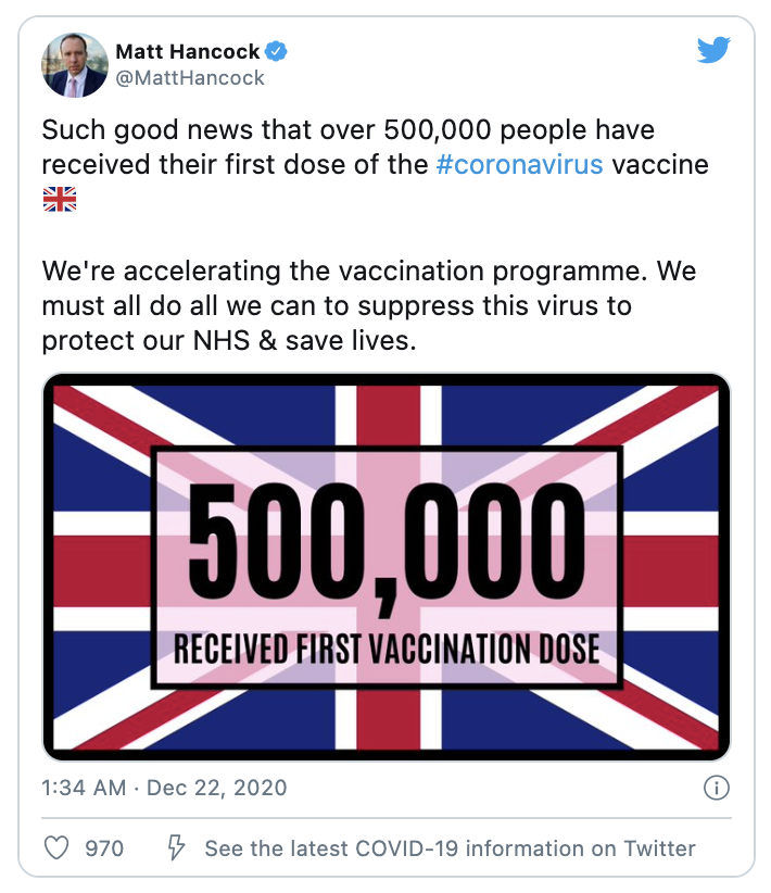 在今日的疫情新闻发布会上,鲍里斯宣布了喜讯:英国已经有50万人注射了新冠疫苗的第一针剂。官方仍在加速,一切都在按照疫苗注射计划进行。