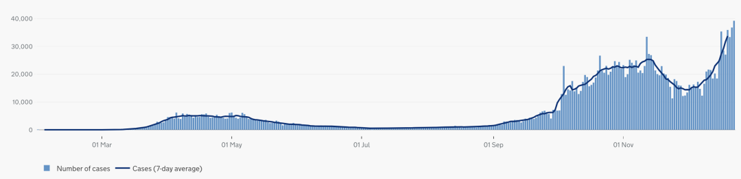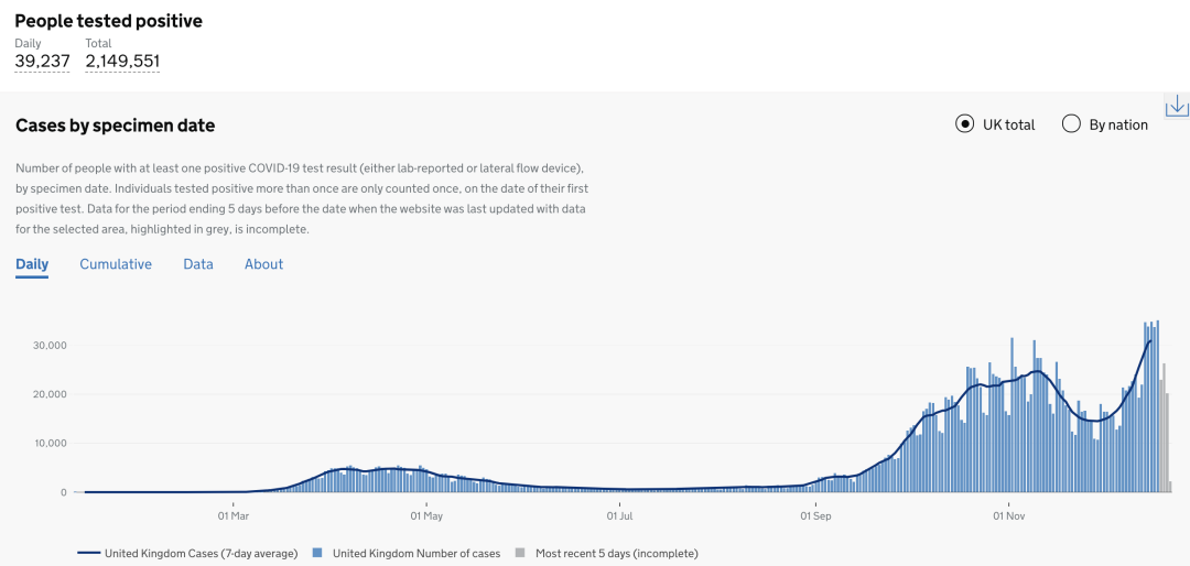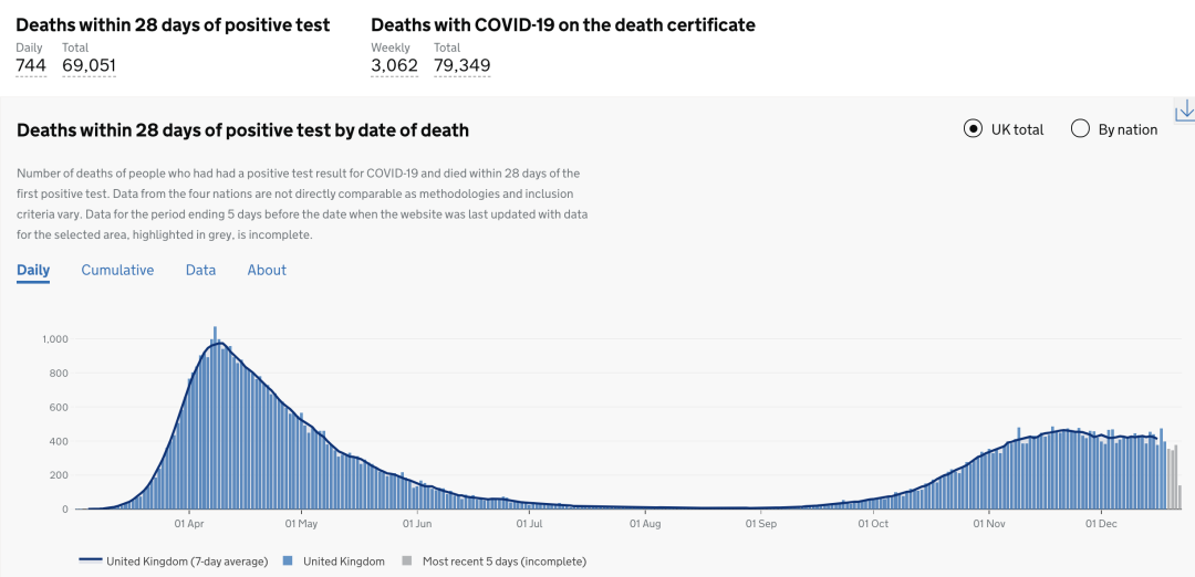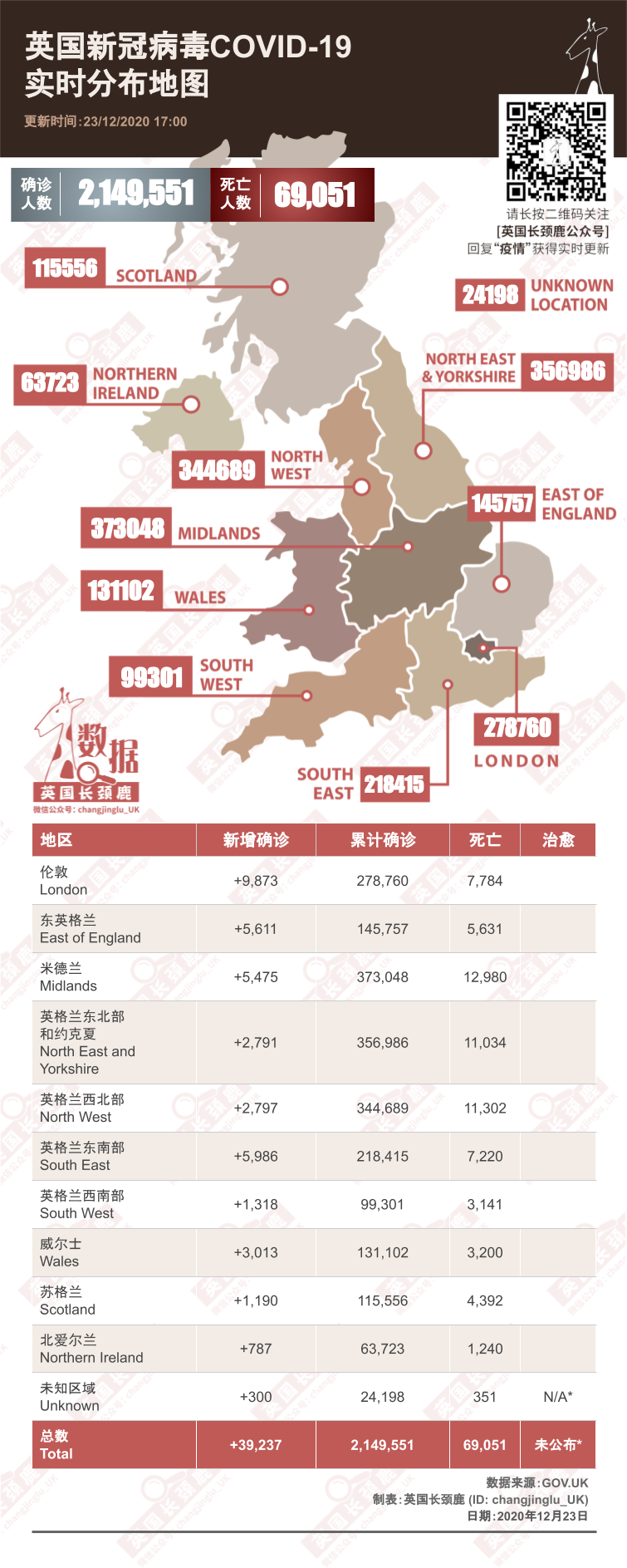 截止至2020年12月23日(周三)英国时间09:00,累计检测结果量48,926,548次(+453,903);累计确诊2,149,551例(+39,237);累计病亡69,051例(+744)。