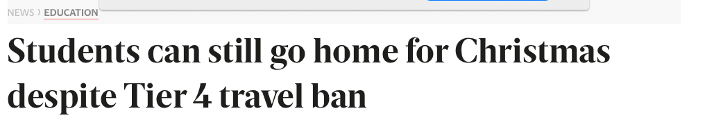 英国大学部长Michelle Donelan证实,Tier 4地区的学生将免于旅行限制,可以在12月3日至明年2月7日期间回家一次,而留学生可以离开英国。