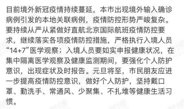 12月20日下午,在北京市政府新闻办组织召开北京市新冠肺炎疫情防控工作第189场新闻发布会上,北京市要求境外回国人员严格执行21天医学观察,并以“14+7”的模式开始实施。