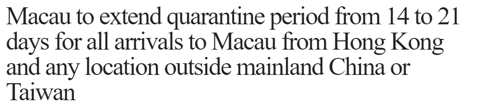 因应外围疫情变化,澳门卫生当局宣布:从12月21晚上10点开始,所有从香港以及除大陆/台湾以外的地区入境澳门的旅客的检疫期由之前的14天延长至21天。