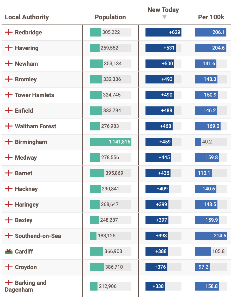 此外,伯明翰(+459)、卡迪夫(+388)以及伦敦多个地区的单日新增确诊都超过了350例。