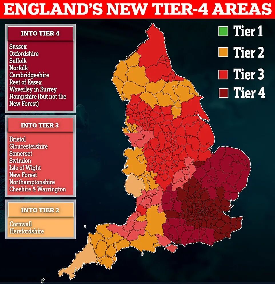 12月24日(周四),英国官方宣布:从12月26日开始,位于英格兰东南部/东部的Norfolk、Suffolk、Cambridgeshire、Oxfordshire和Hampshire大部分地区升级为4级最高级封锁;