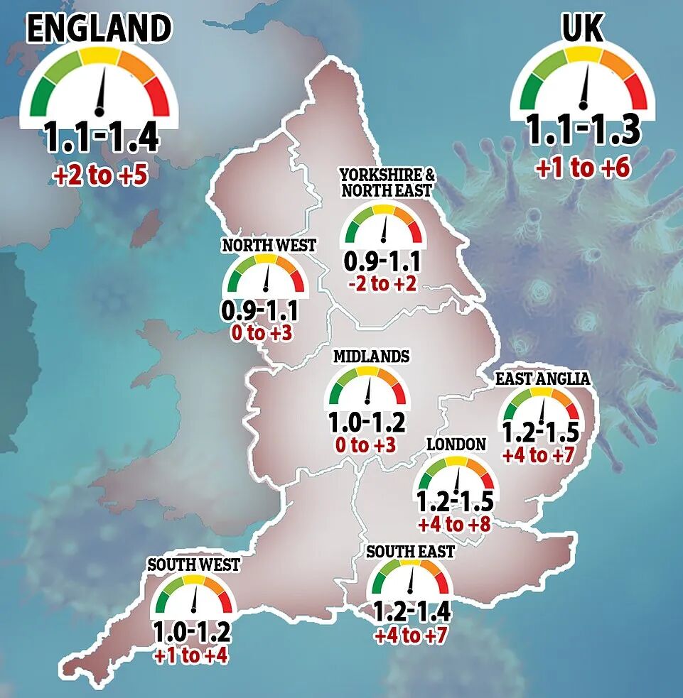英格兰NHS所有地区的R估计值都在1以上(疫情在全国大部分地区都在增长):其中伦敦、英格兰东南部和英格兰东部地区的R估值可高达1.5。