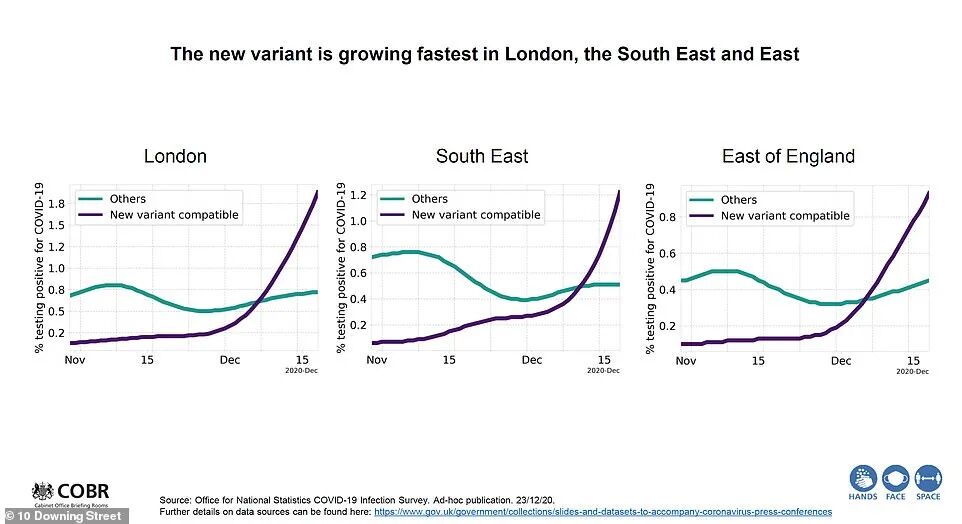12月24日(周四),英国统计局ONS研究发现,新的新冠变种可能占到英国目前所有新增确诊病例的一半——在英格兰49%的新诊断病例可能是VUI-202012/01变种;这也是为什么近期英国新增确诊急剧上升,传播加速的原因。