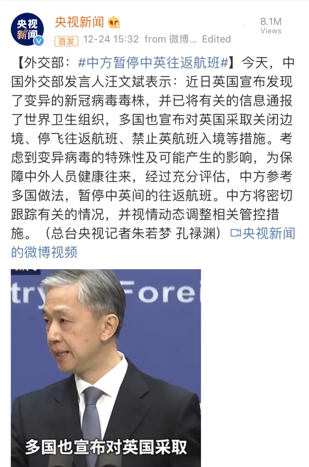 12月24日(周四),国内官方表示:近日英国宣布发现了变异的新冠病毒毒株,并已将有关的信息通报了世界卫生组织,多国也宣布对英国采取关闭边境、停飞往返航班、禁止英航班入境等措施。