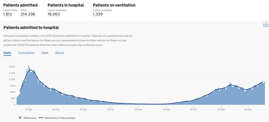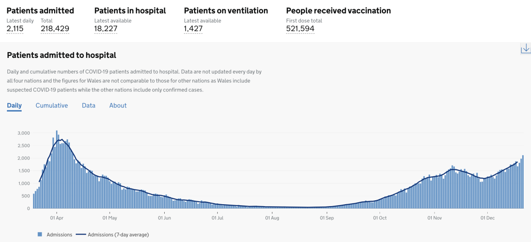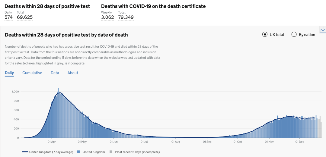 截止至2020年12月24日(周四)英国时间09:00,累计检测结果量49,434,314次(+507,384);累计确诊2,188,587例(+39,036);累计病亡69,625例(+574)。
