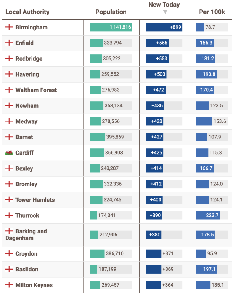 此外卡迪夫(+425)以及伦敦多个地区的单日新增确诊都超过了350例。