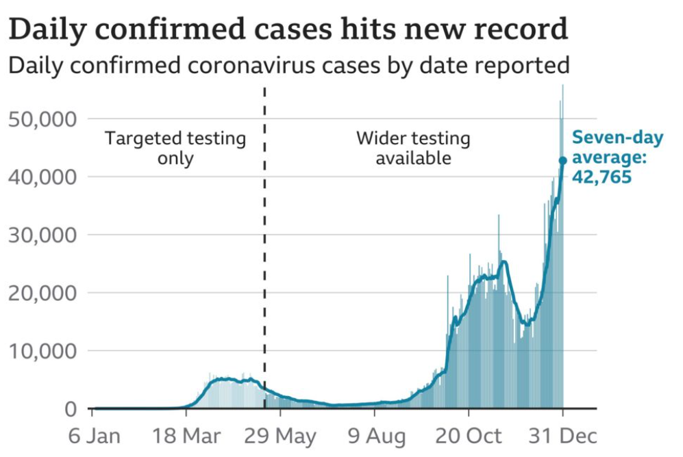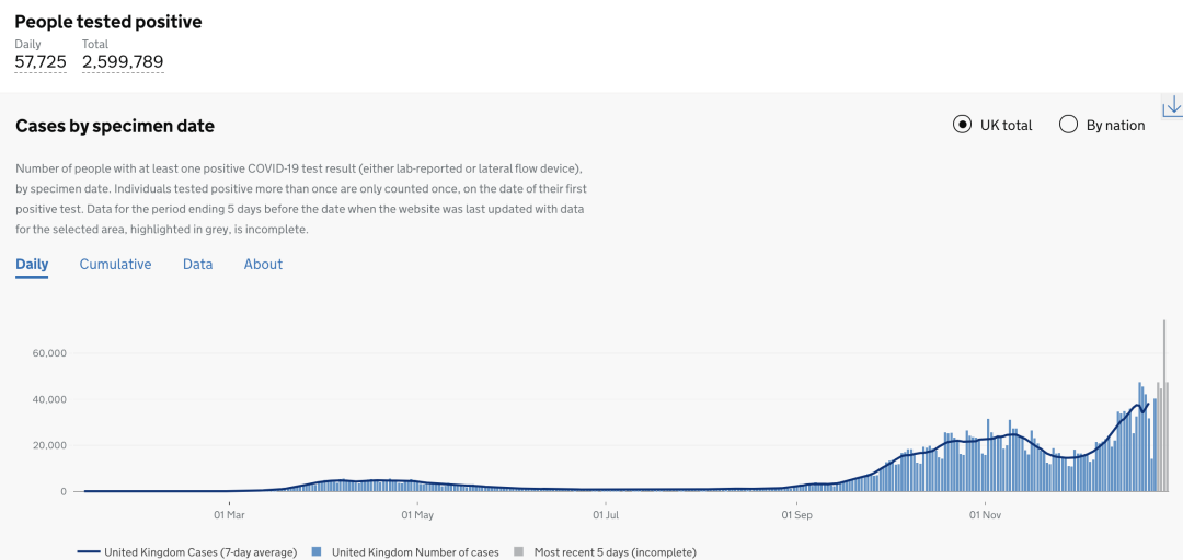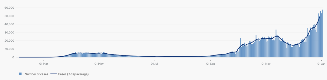 英国每日新增病例数连续5天突破5万例。这与一周后的预期确诊数字相比,还相对温和。毫无疑问,圣诞假期的影响将会在下个月,在全国各地反映出来。