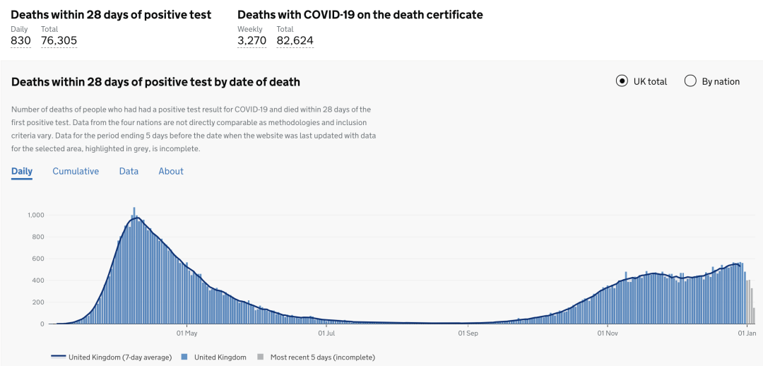截止至2021年1月5日(周二)英国时间09:00,累计检测结果量54,302,701次(+464,611);累计确诊2,774,479例(+60,916);累计病亡76,305例(+830)。